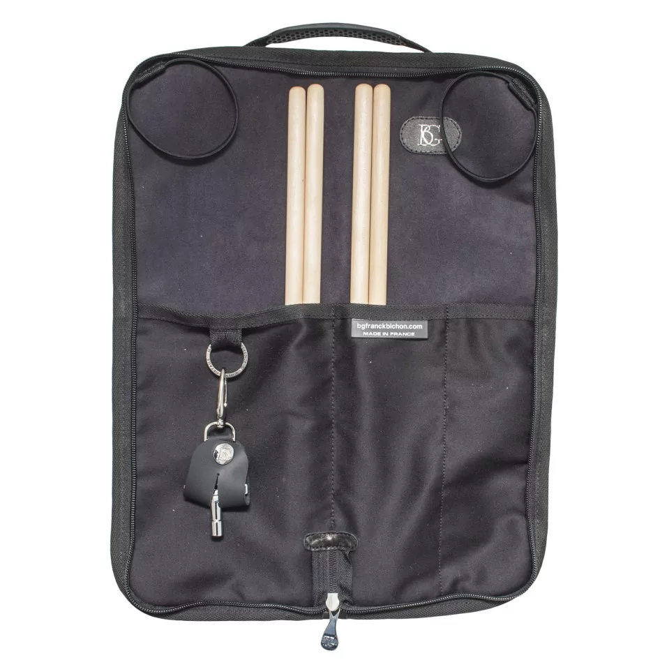 3 Taschen für Drumsticks, und ein Leder-Schlüsselanhänger. Schwarzer verstärkter Stoff.