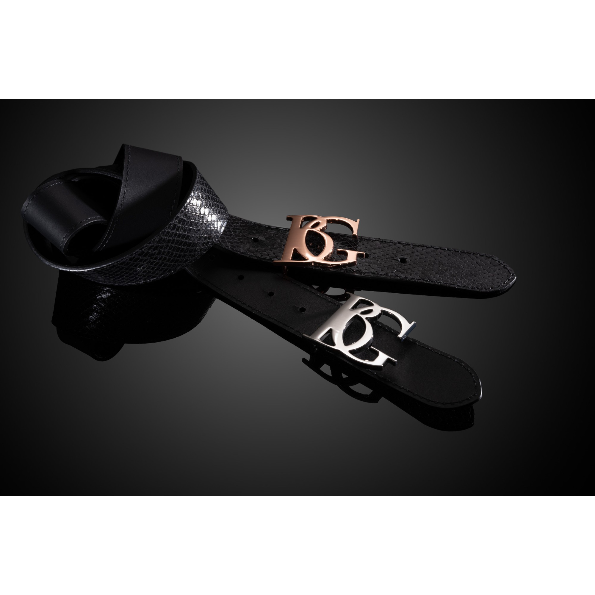 Luxus-Leder-Gürtel in Schwarz, glatt oder Schlangeneffekt, mit austauschbarer nickel- oder roségoldener Schnalle.