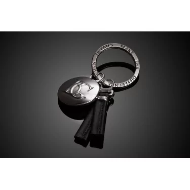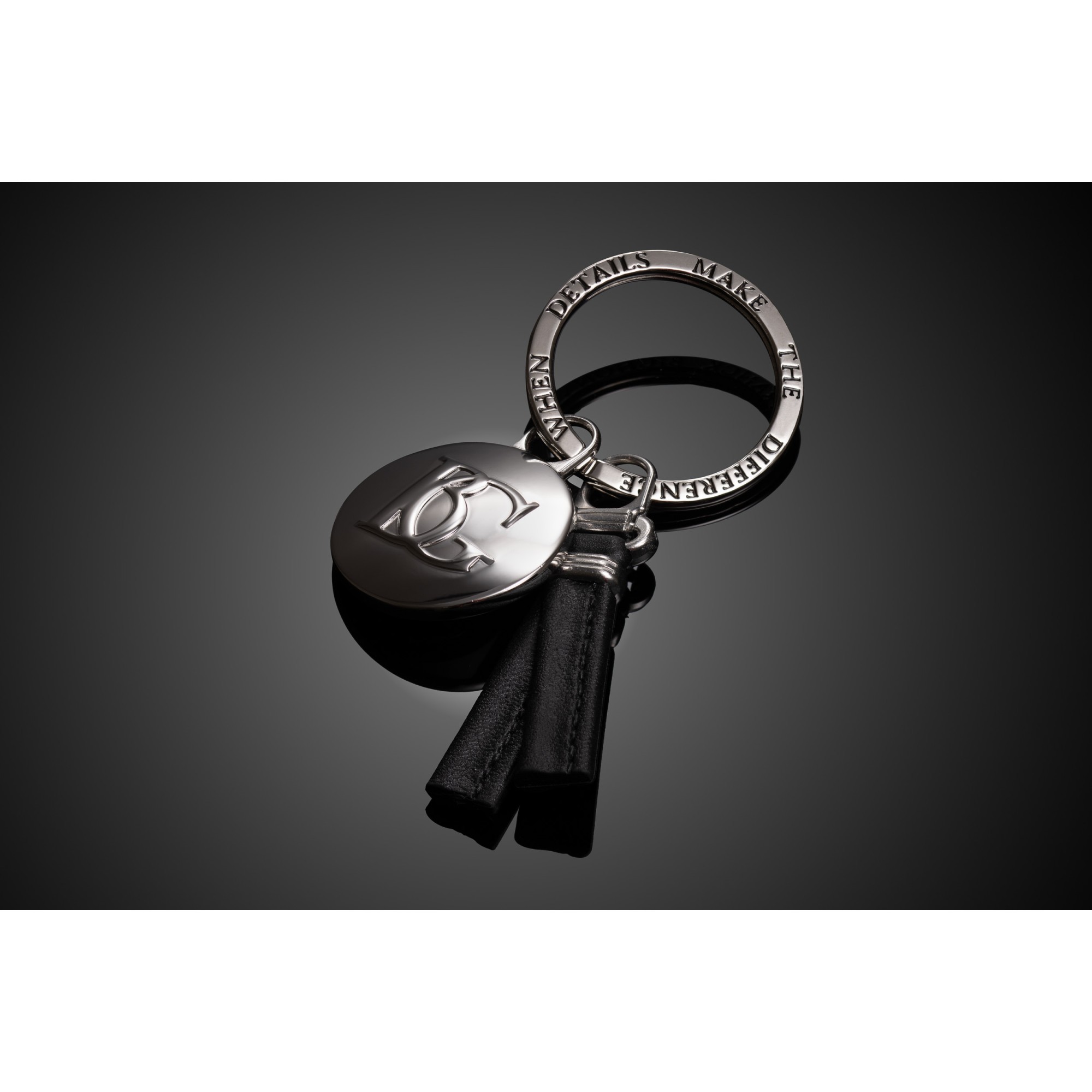 A sleek black leather luggage tag featuring an elegant metallic logo.