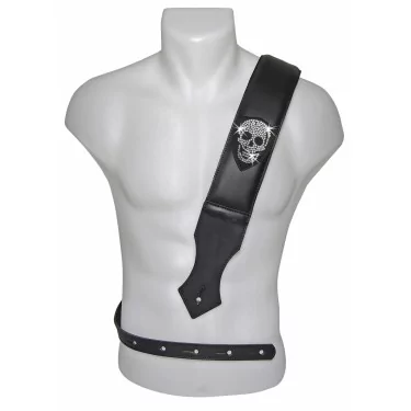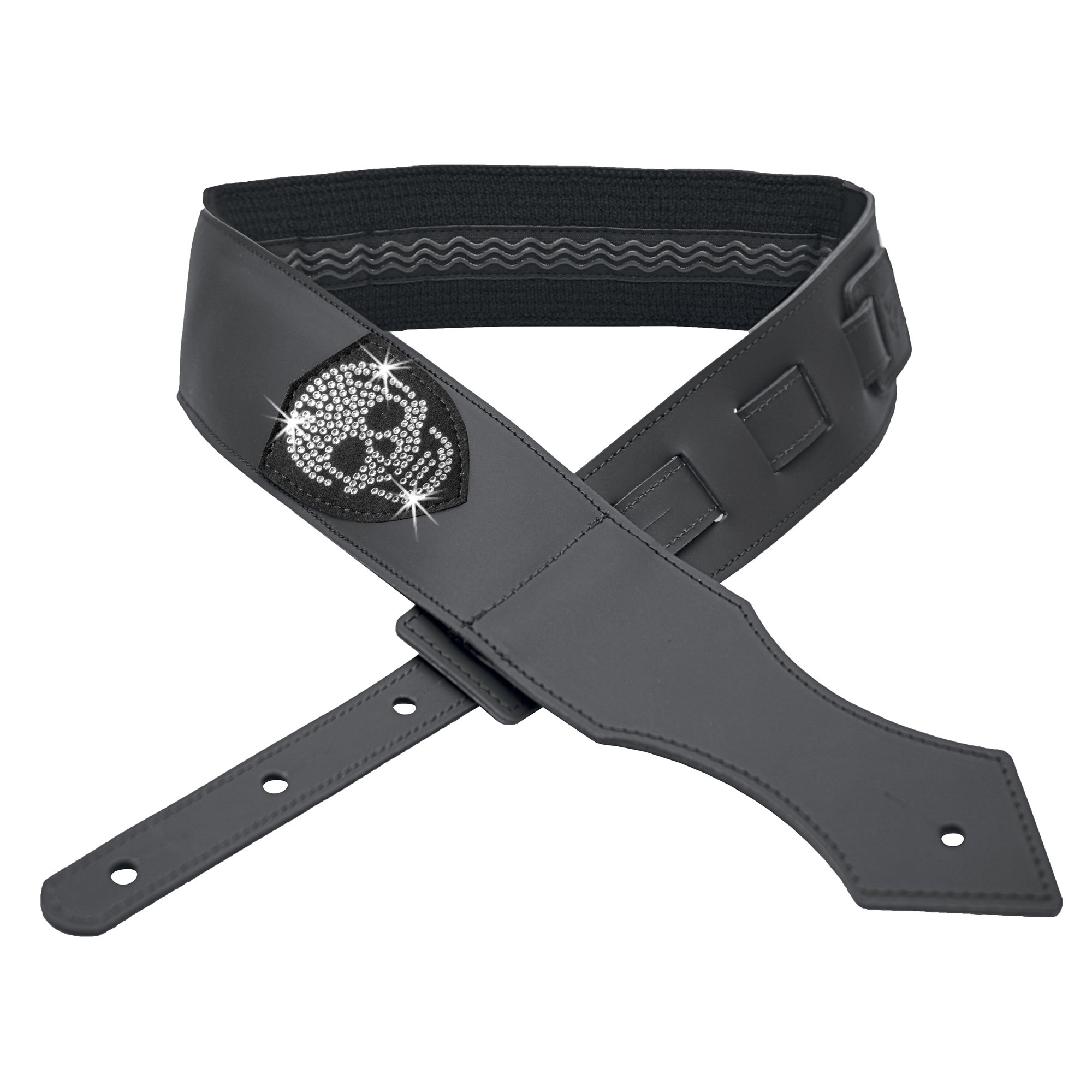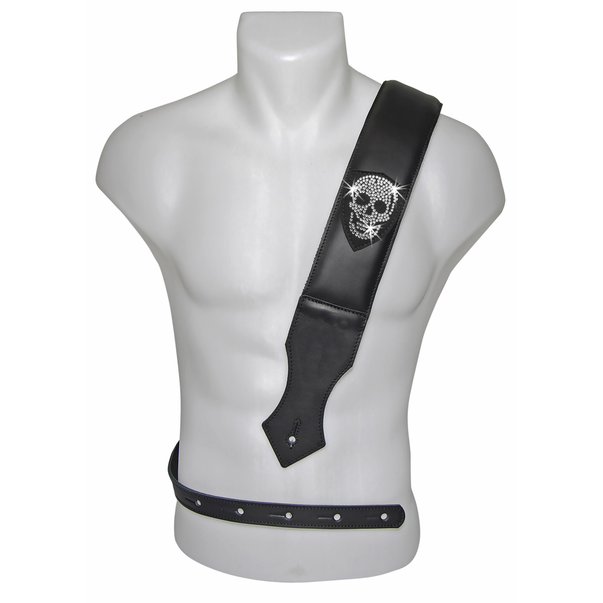 Bass and electric guitar Premium GLAM strap. Black leather, polar wool with cotton padding and non-slip ribbon. With Peace & Love Crystals from Swarovski®