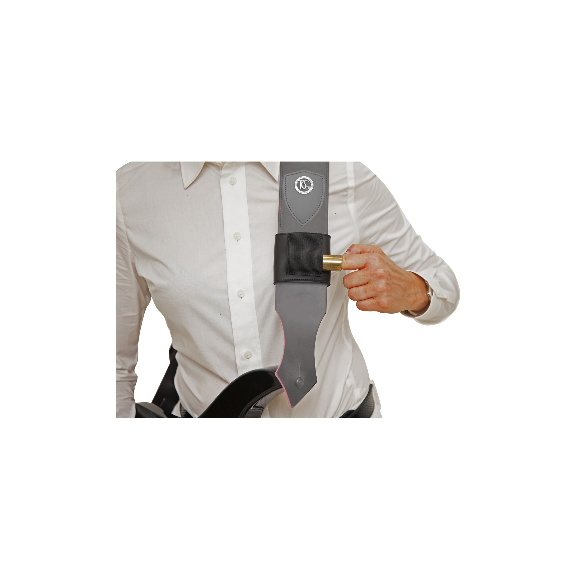 Cuello de nylon acolchado en algodón. Ajustador en ABS. Gancho en ABS para colocarse en la boca de la guitarra.