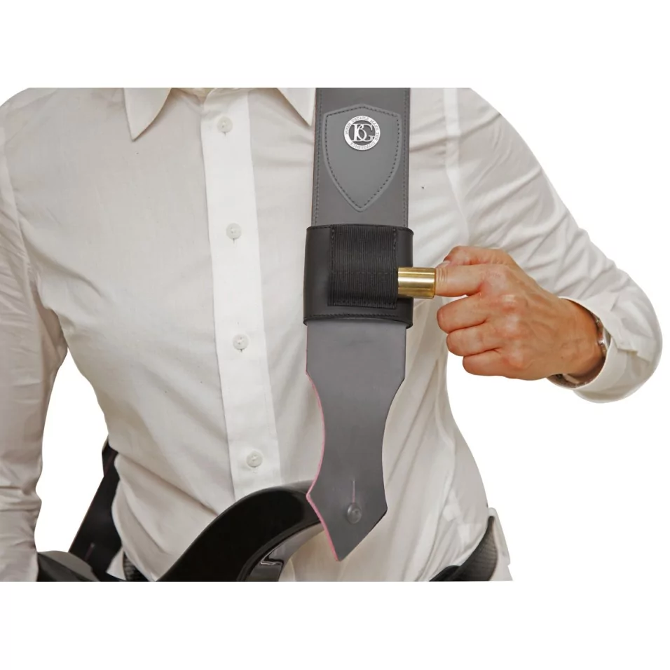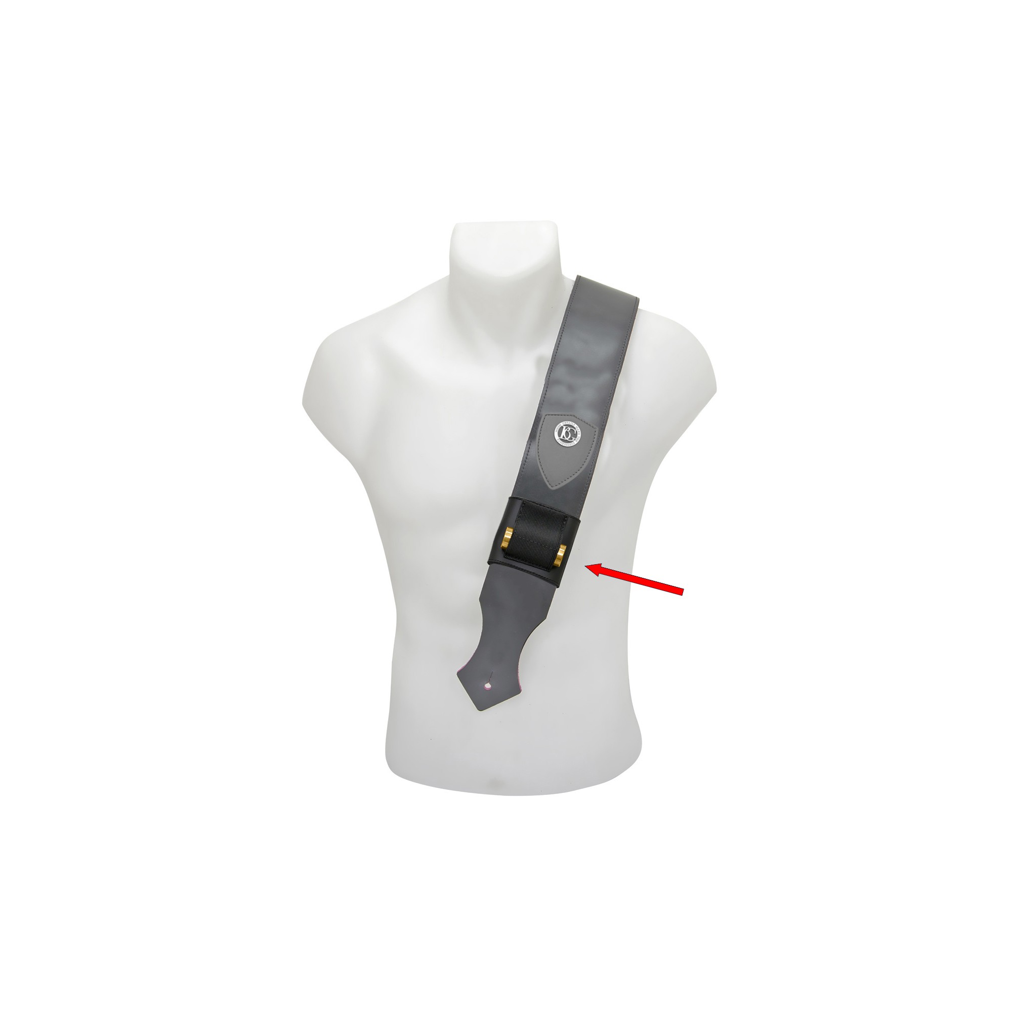 Para guitarras y bajos eléctricos. Cuero negro mate con banda de cuero marrón mate. Forro polar + rizo de algodón + banda antideslizante.