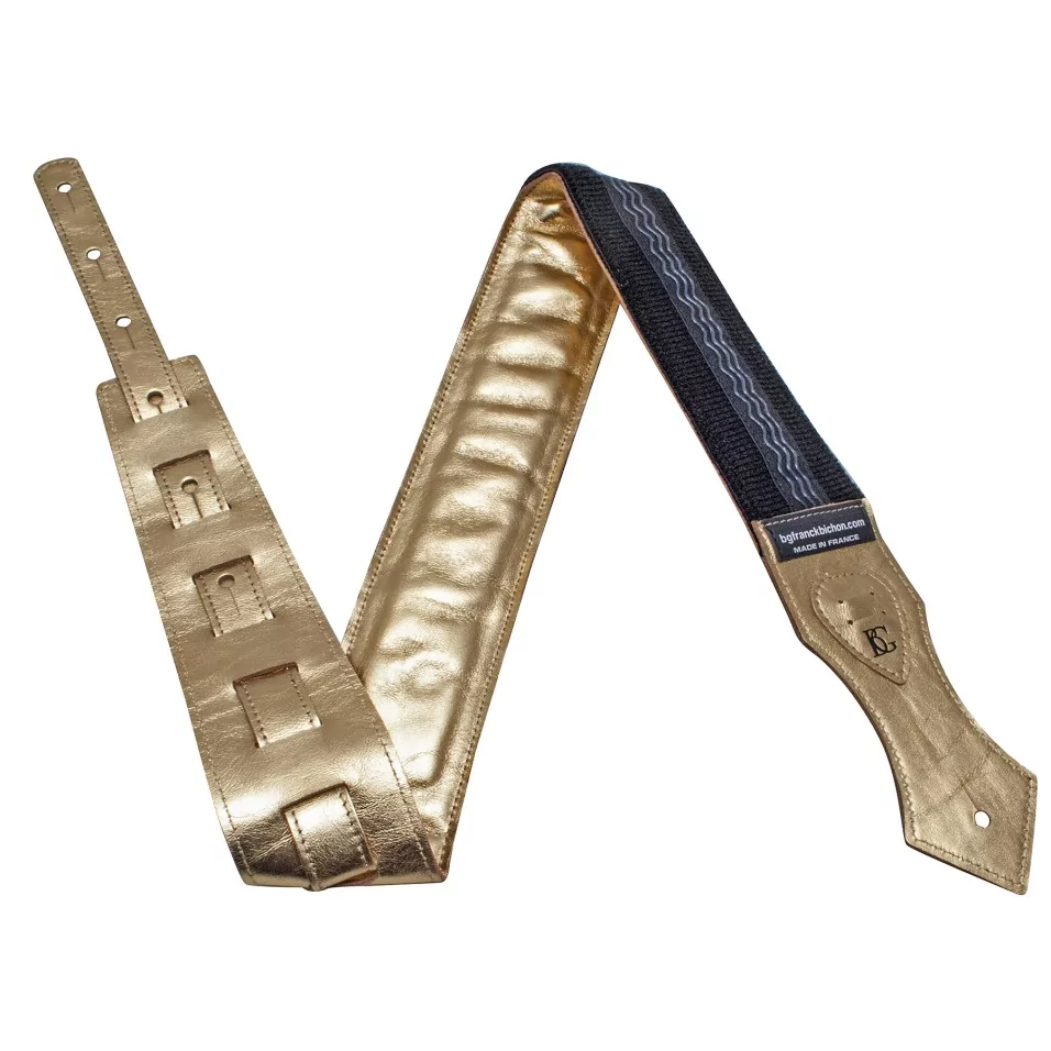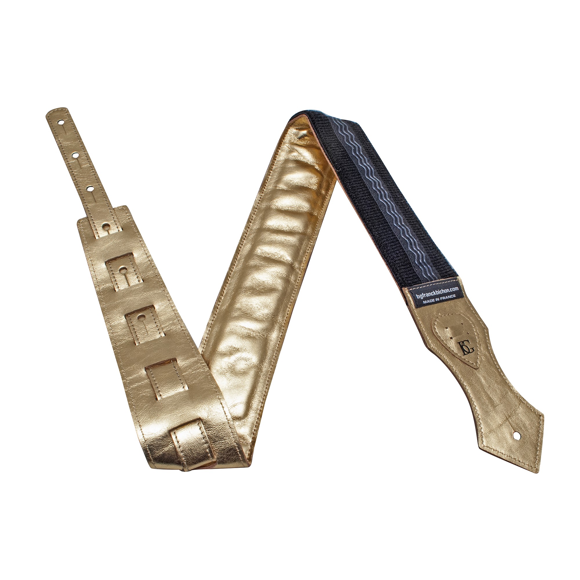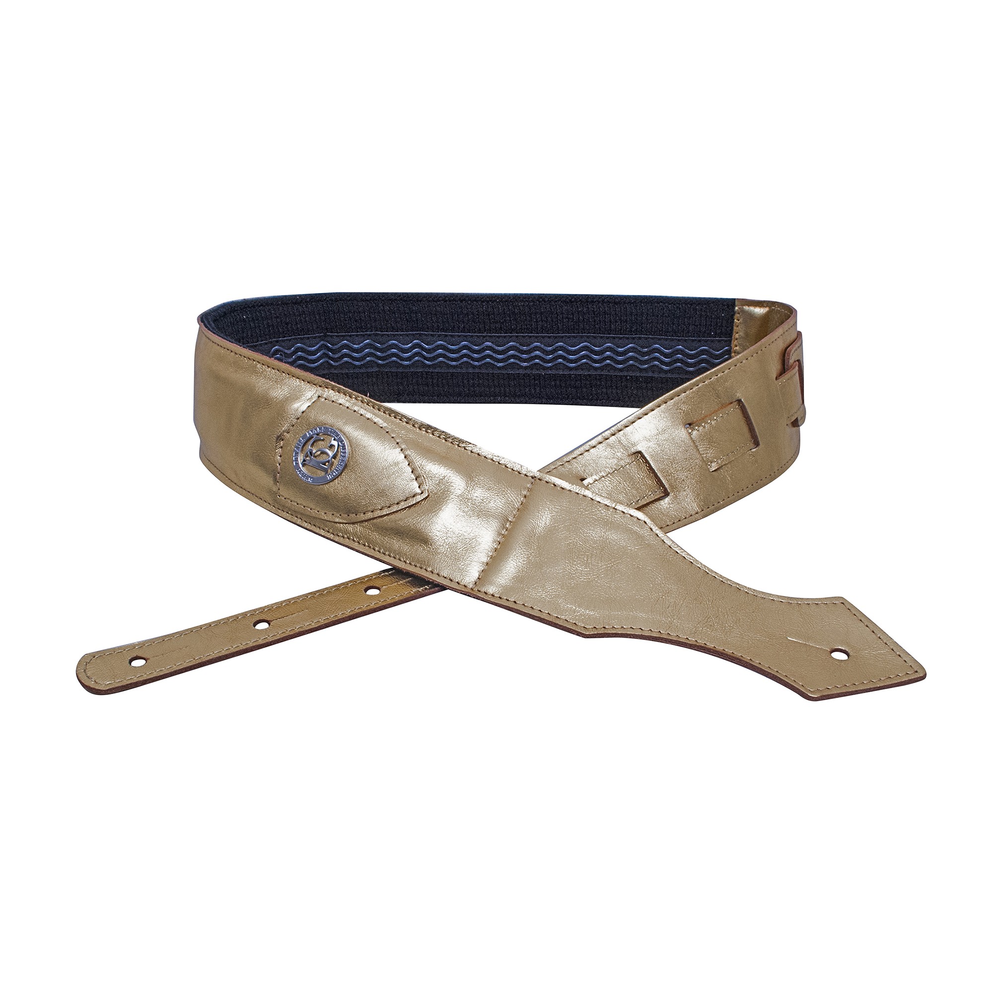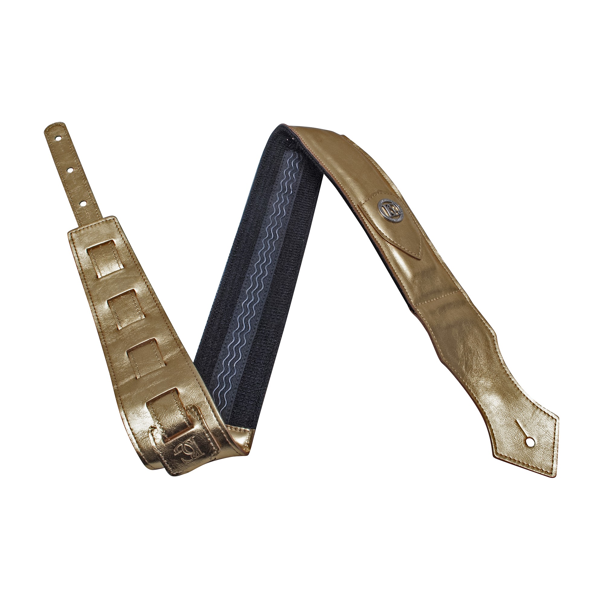 Para guitarras y bajos eléctricos. Cuero estampado en color oro , con acolchado de lana polar y algodón , más banda antideslizante .