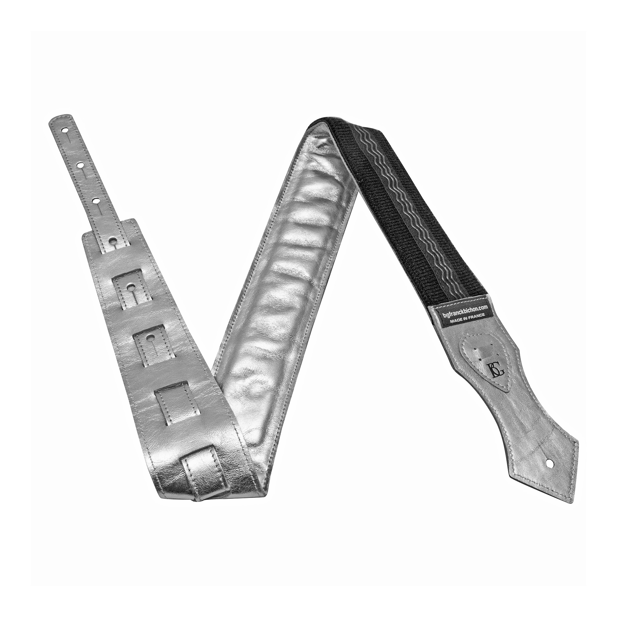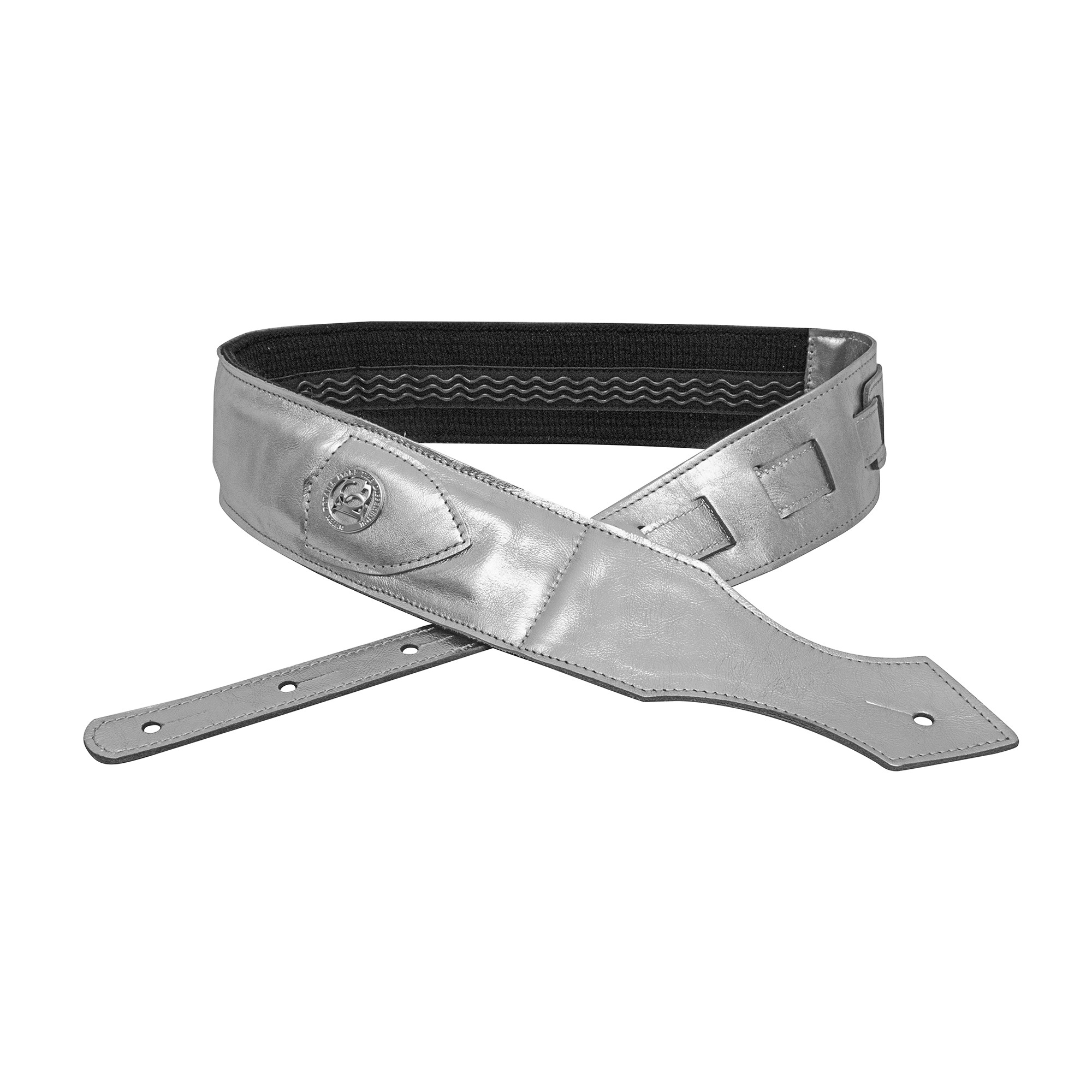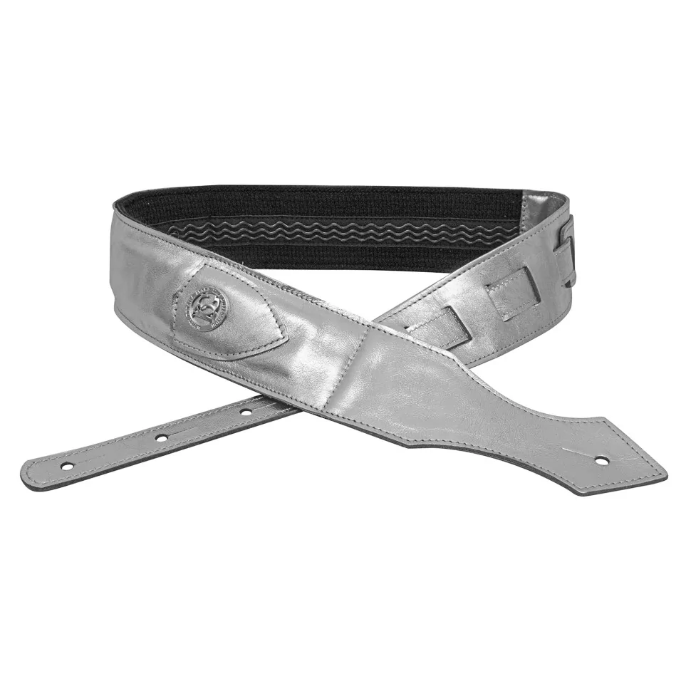 Para guitarras y bajos eléctricos. Cuero estampado en color plata, con acolchado de lana polar y algodón, más banda antideslizante.