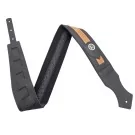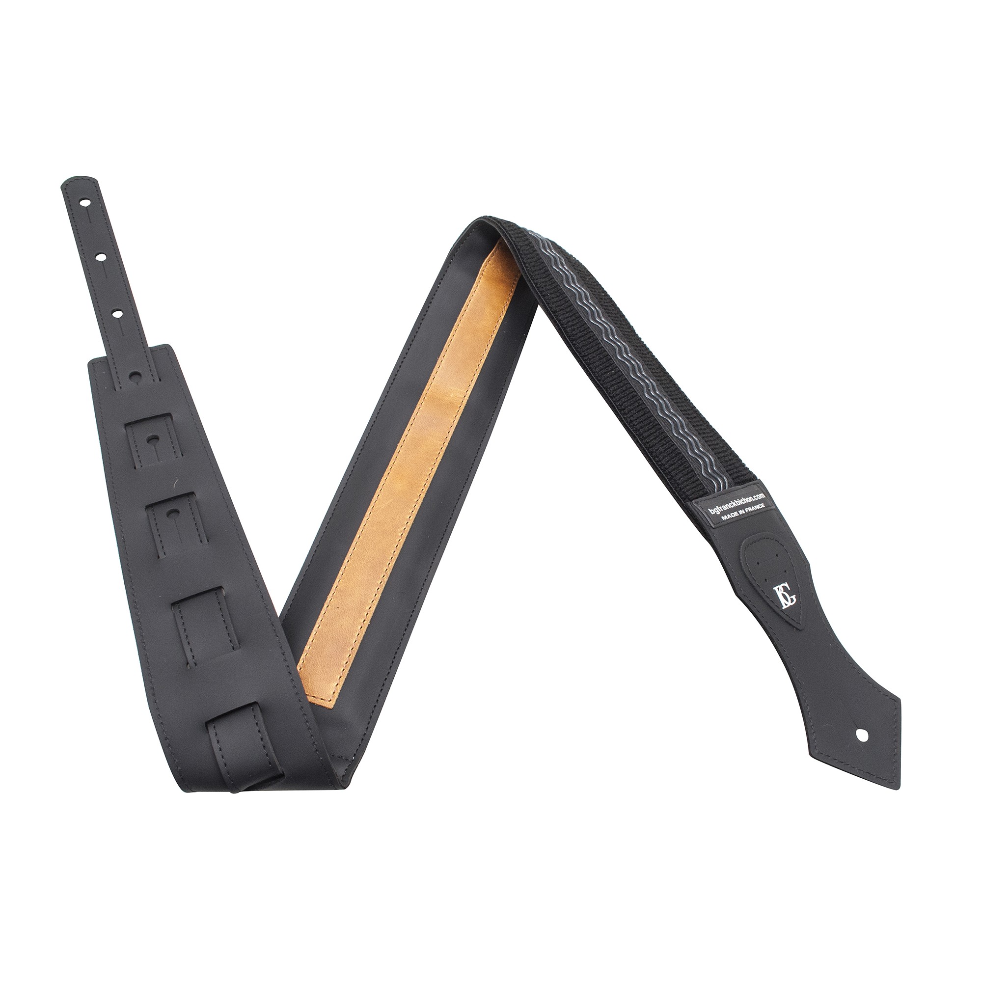 Para guitarras y bajos eléctricos. Cuero negro mate con banda de cuero camel vintage. Acolchado con forro polar, rizo de algodón y banda antideslizante.