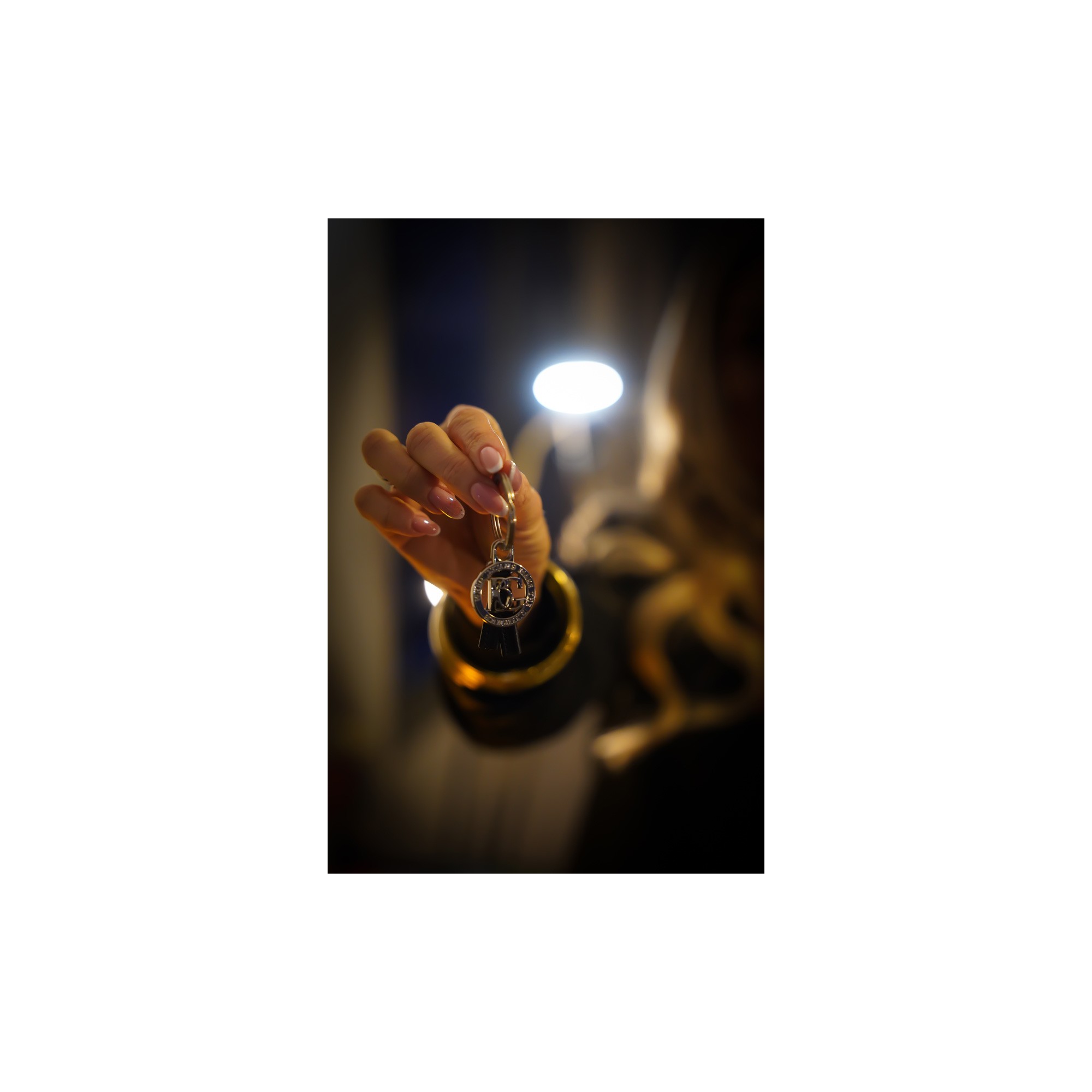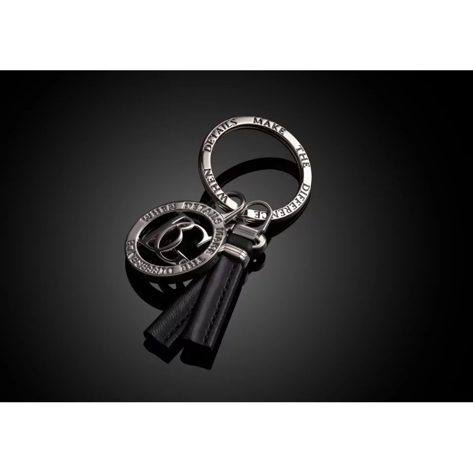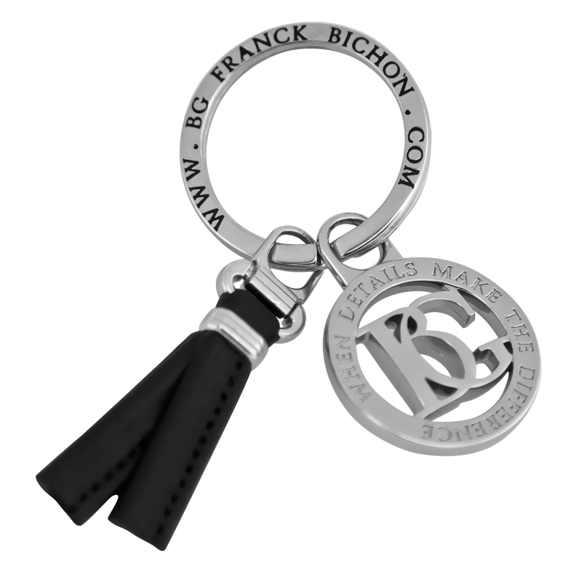 Elegante, llavero en cuero negro con el logotipo de BG, realizado con elementos de Swarovski