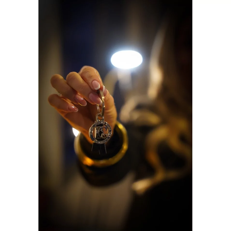 Llavero de metal niquelado para csujección de cinturón con logotipo BG France.