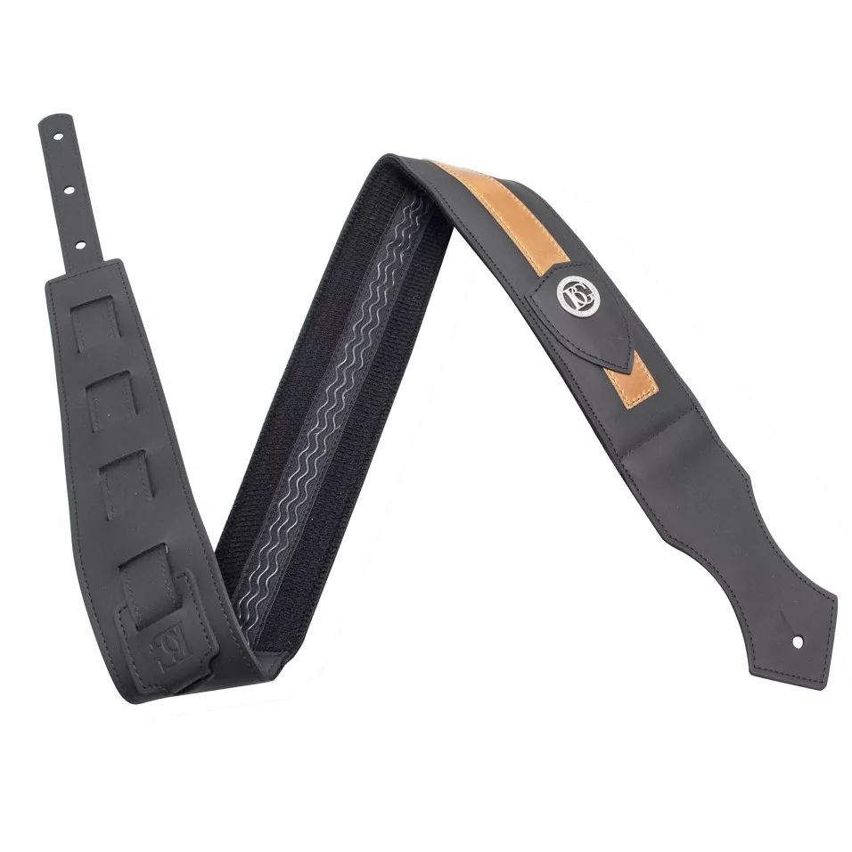 Pour guitares électriques et basses. Cuir Noir mat avec bande de  Cuir Camel Vintage . Doublé de laine polaire + éponge coton + bande Antiglisse.