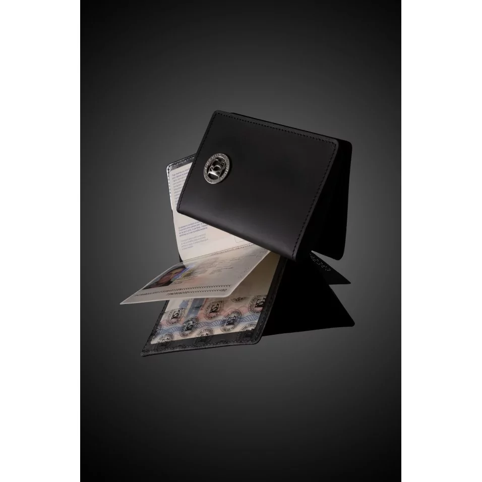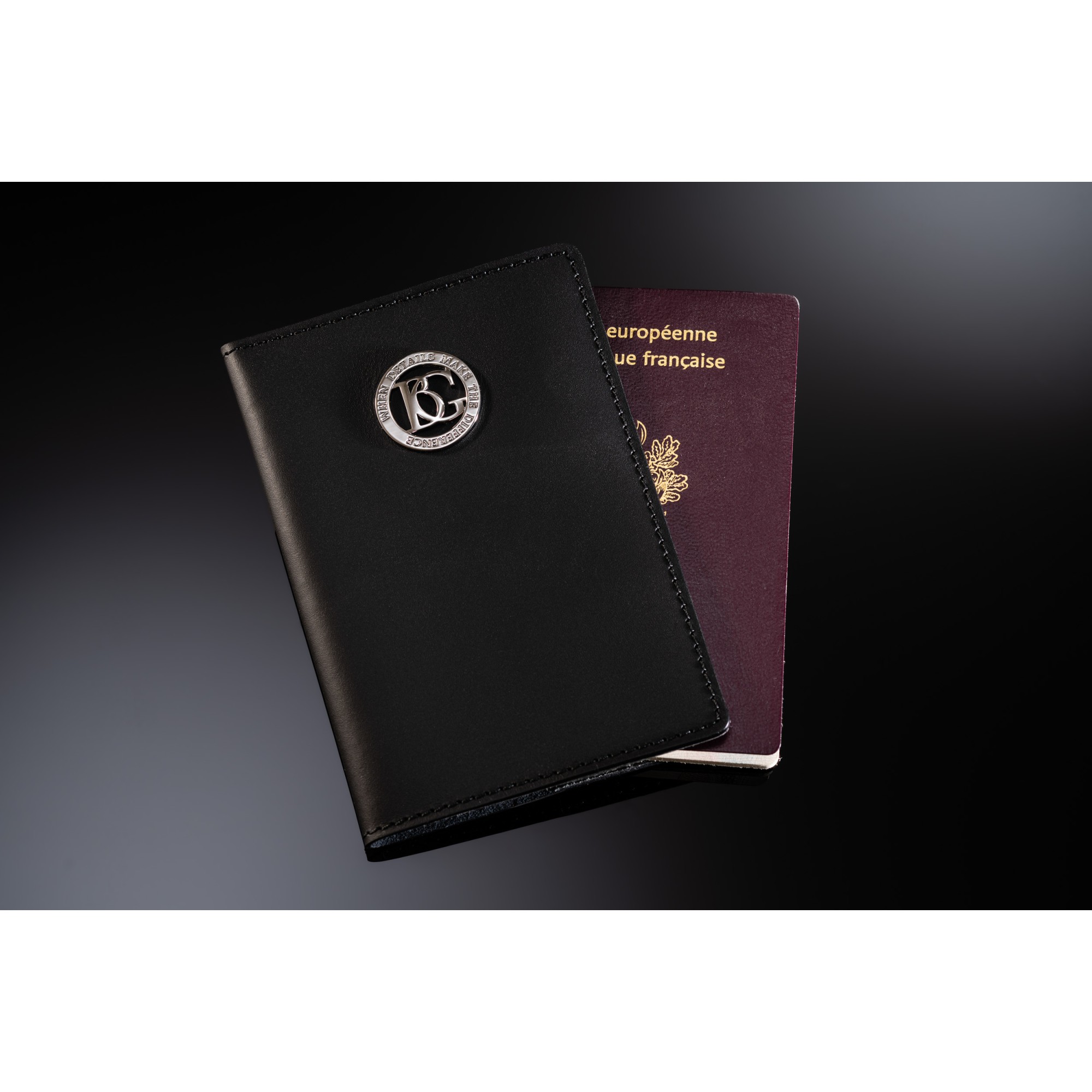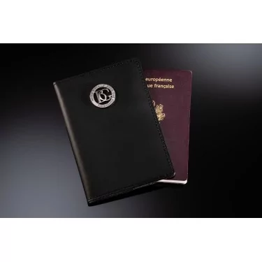 Élégant étui pour passeport en cuir noir.